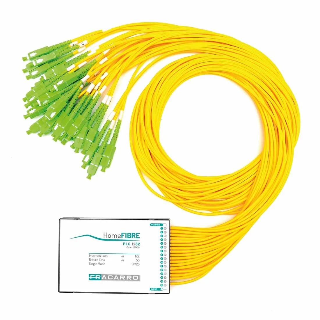 Partição óptica de 64 vias adequada para construção de ROEs, com tecnologia de guia de onda planar permitindo perdas de inserção muito baixas .